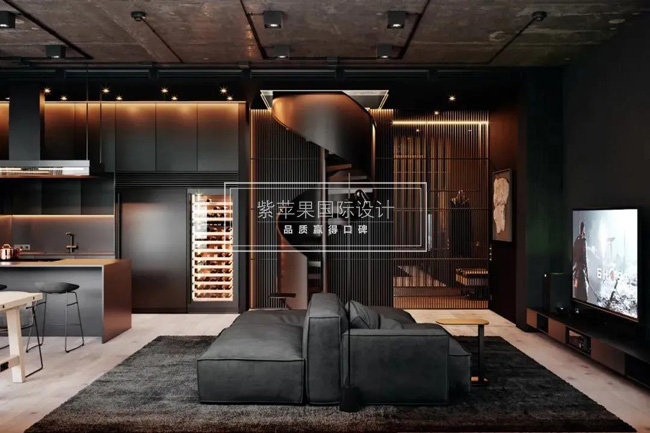 黑色时尚是神秘的,是工业风的自由豁达,想把两个结合在一起,非常舒适。黑色墙壁的天花板、薄原木地板、明装的黑线管、纤细的黑色金属楼梯和家具,粗犷中带有质感。