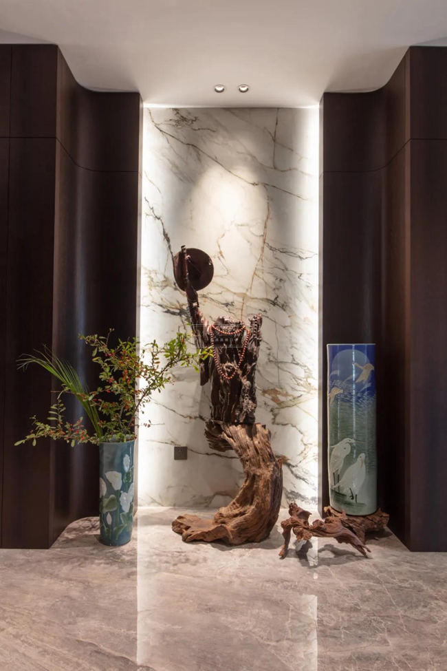 两侧置顶的墙板,深咖色的质感,深邃、稳重。大理石材瓷砖,密缝连纹铺贴,贯穿整个过道区域,自然流畅。