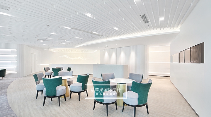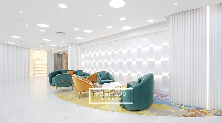 大堂设计贴合现代极简理念,充分利用空间安置多功能区,大面积留白的区域搭配由明黄、湖绿和金属色组成的软装,软硬装格调统一凸显质感。二楼地面多采用地板、地毯等材质,有效降低女士脚踩高跟鞋发出的噪声干扰,也会提高她们在走路时感受到的舒适感。洽谈区的落地玻璃窗广纳自然光线,将朝暮风光、四时景致全盘纳入其中,为空间点染别样雅致的气息。