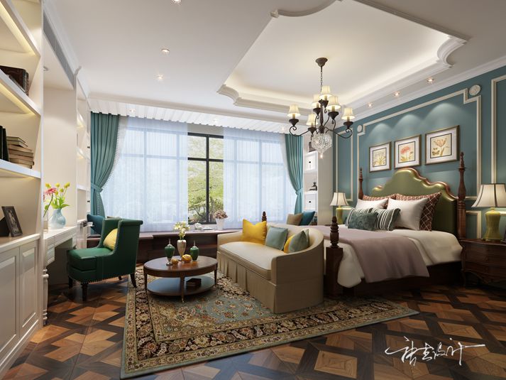 如果说古典美式风格线条复杂、色彩低沉,本案设计风格则在古典欧式风格的基础上,以简约的线条代替复杂的花纹,采用更为明快清新的颜色,既保留了古典欧式的典雅与豪华,又更适应现代生活的悠闲与舒适。